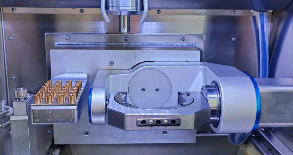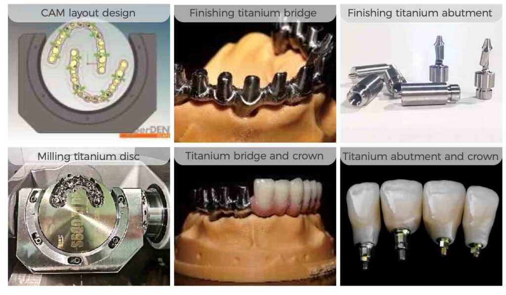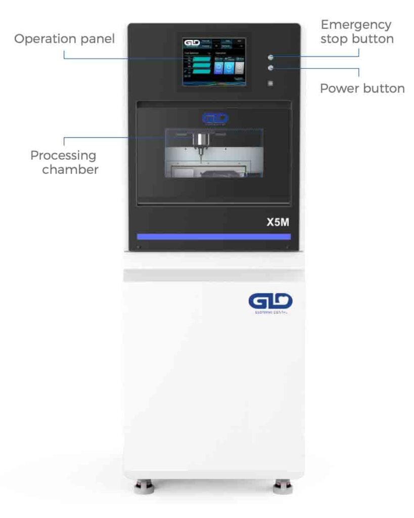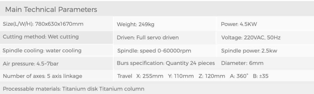 X5M Wet milling machine High-precision titanium bridge and crown machining. C Type (1pc disc holder, 3pcs pin holder) Machine Benefits Innovative secondary C-type fixture can increase 98mm zirconia disc milling output to 35-40pcs crowns 5-axis linkage can realize large-angle bridge processing Integrated computer and touch screen Equipped hi-precision ball screw Ultra-precision servo drive system Excellent mechanical structure ensures mechanical precision and long lifetime. The one-piece cast aluminum structure ensure more stably Integrated cooling tank and liquid circulation pump High-performance spindle with automatic milling bur change LED lights display machine status in real time
